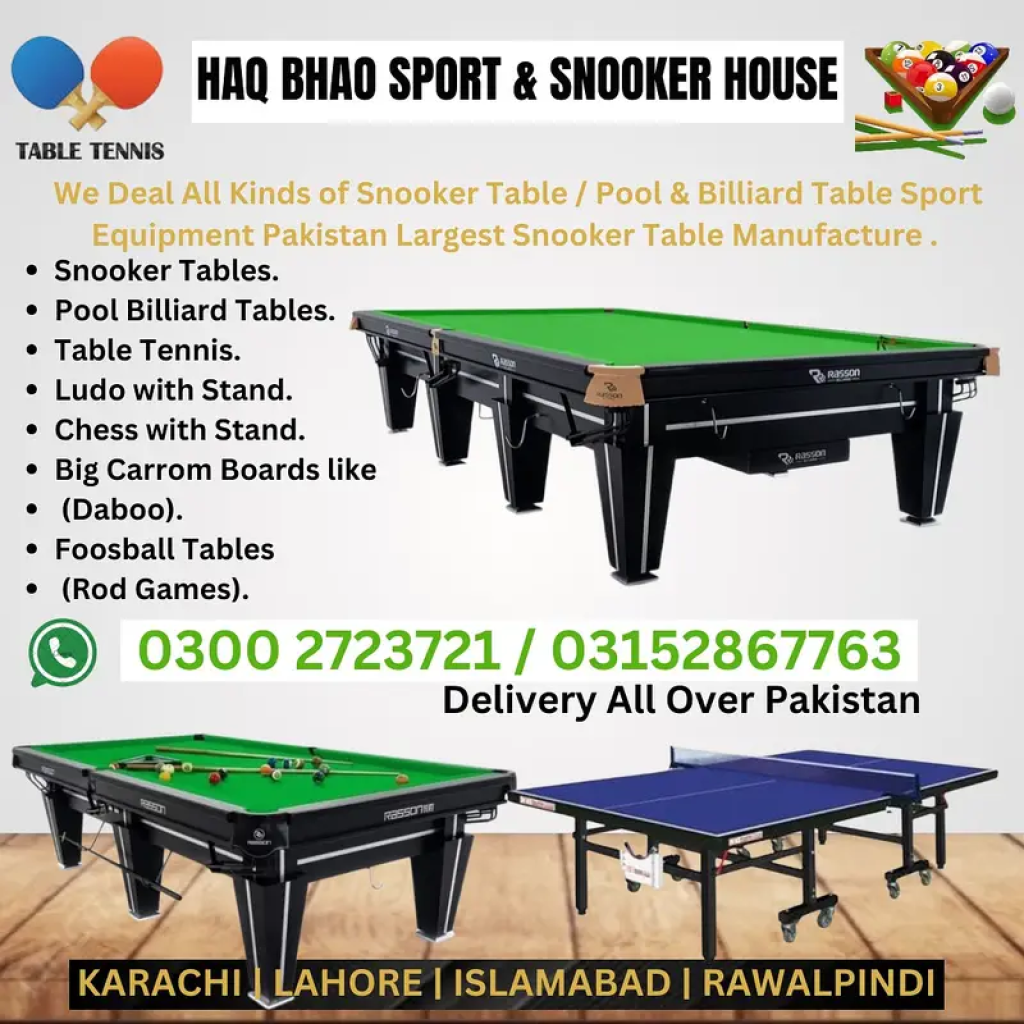 -------------------------------Haq Baho Sports & Snooker House---------------------------we Deal In All Type Of Snooker Table | Football Game | Foot Ball Game | Table Tennis | Carrom Board | Dabbo | foos ball | 8 Pool table*Best quality Snooker and Billiards Tables available for sale Pakistan *Snooker Tables Quality Is 100% GuaranteedWholesale price mein available hai