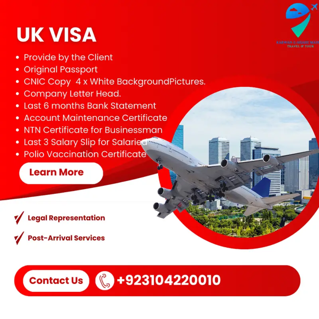 Required Documents:Provide by the Client 1. Original Passport2. CNIC Copy 3.4 x White Background Pictures. 4. Company Letter Head. 5. Last 6 months Bank Statement 6. Account Maintenance Certificate 7. NTN Certificate for Businessman 8. Last 3 Salary Slip for Salaried9. Polio Vaccination Certificate-------------------------------------Provide 1. Hotel Booking2. Flight Booking3. Travel Insurance4. Covering Letter. 5.  Travel Enterny