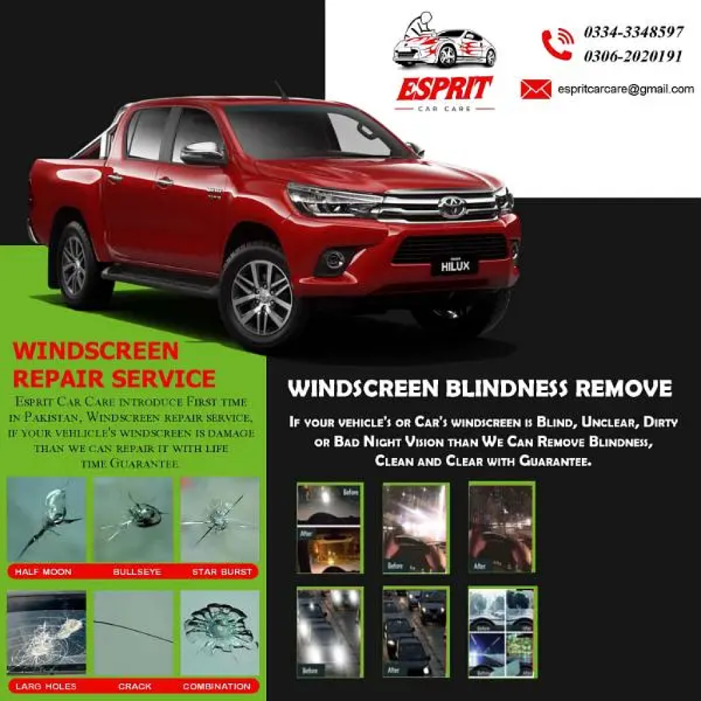 "Esprit Car Care"We are Introduced First time in Pakistan windscreen repair service at your door step if your vehicle windscreen is damage then we can repair it with life time guaranteeStar Chip, Bulleye, Long / Short CrackMultiple Cracks. . . . etc. . . If your Vehicle Windscreen is dirty, Blind or Night Vision is not Clear then we Clean & Clear it With Guarantee. If your Vehicle Windscreen is Demage and you want to replace it, we can Replacement it as per Customer Need.