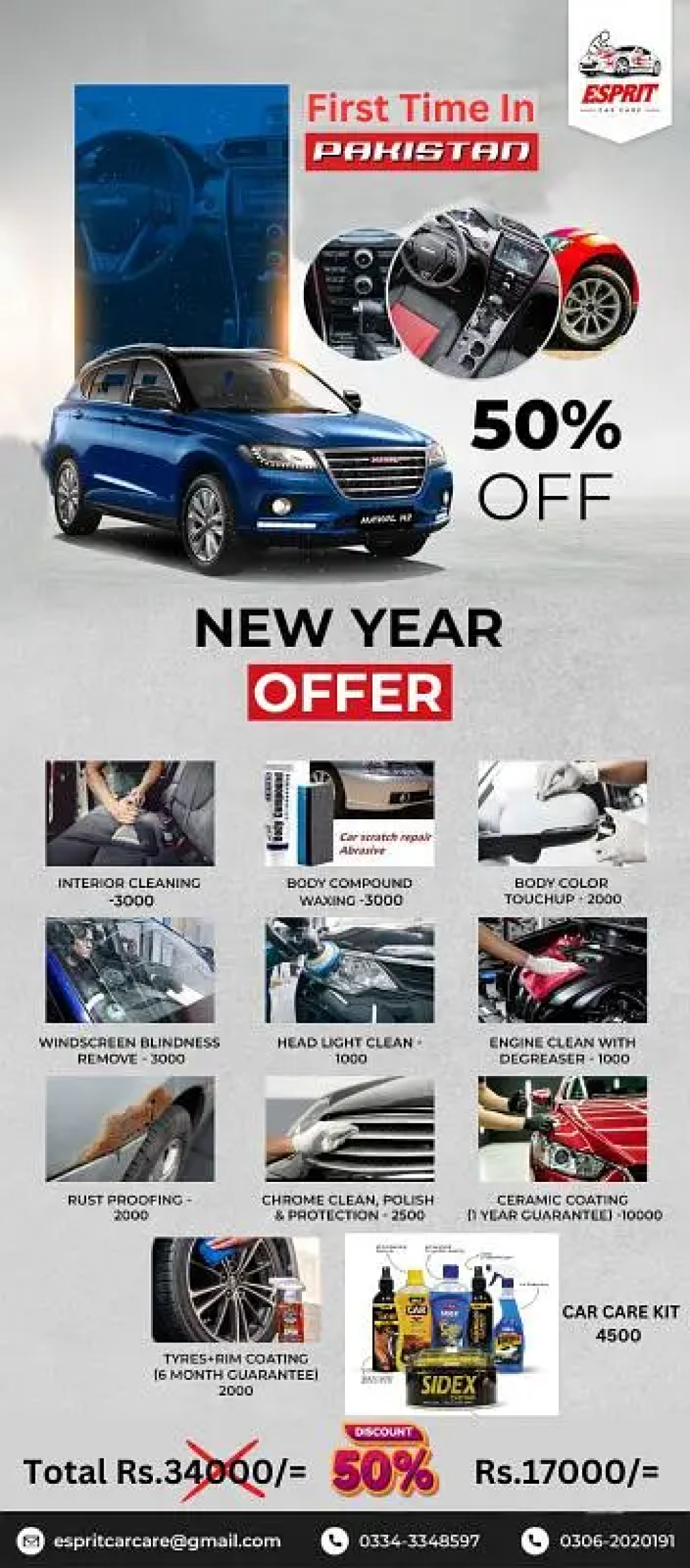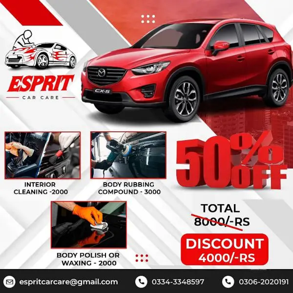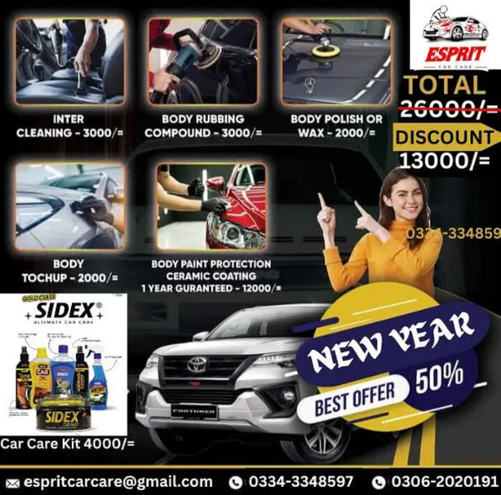 "Esprit Car Care"New Year Discount Offer 2025Only For Karachi DOORSTEP SERVICE AVAILABLE We Are providing Best Service In karachiInterior cleanWax And TouchupBody CompundCar Ceramic Coating Car Detailing Glass Coating PPF Application Care Care Products GIFT as complementary Call for more details 0306/2/0/2/0/1/9/10334/3/3/4/8/5/9/7
