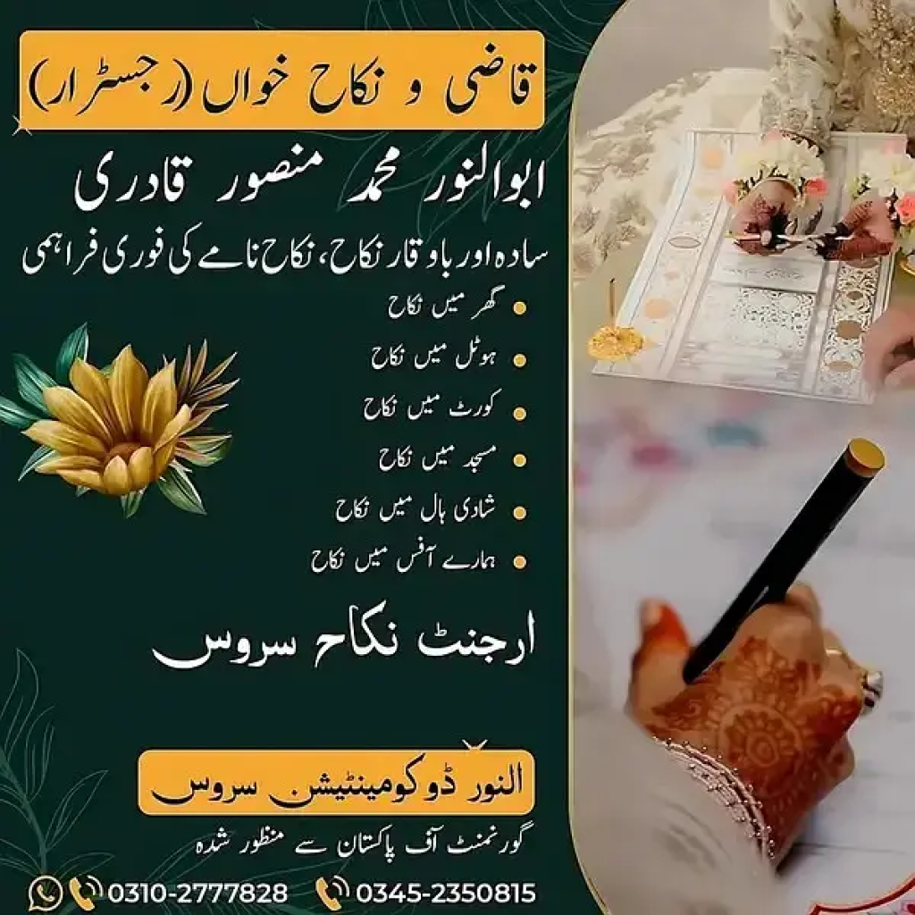 "Perform Nikah with Ease and Blessings!"We offer authentic services for Nikah solemnization based on Islamic and legal principles. Contact (View phone number)Registered Qazi ServicesComplete guidance on Haq Mehr, witnesses, and other Nikah-related mattersInstant Nikah Nama RegistrationIslamic and legal consultationMake your special moments valid and memorable. Our goal is to make your ceremony simple, joyful, and fully compliant with Shariah. Contact us today to make your Nikah blessed and delightful!Qazi Nikah Khawan Services KarachiContact (View phone number)whatsapp 0/3/1/0/2/7/7/7/8/2/8-------------------------------------------------------"نکاح کریں آسانی اور برکت کے ساتھ!"ہم فراہم کرتے ہیں شرعی اور قانونی اصولوں کے مطابق نکاح خوانی کی مستند خدمات۔ رجسٹرڈ قاضی کی خدمات حق مہر، گواہان اور دیگر نکاحی معاملات میں مکمل رہنمائی فوری نکاح نامہ رجسٹریشن اسلامی اور قانونی مشاورتاپنی خوشیوں کو معتبر اور یادگار بنائیں۔ ہمارا مقصد آپ کی تقریب کو آسان، پرمسرت اور شریعت کے عین مطابق بنانا ہے۔ آج ہی رابطہ کریں اور نکاح کو خوشگوار اور بابرکت بنائیں!قاضی نکاح خواں سروسز کراچیQazi Nikah Khawan Services KarachiContact (View phone number)whatsapp 0/3/1/0/2/7/7/7/8/2/8