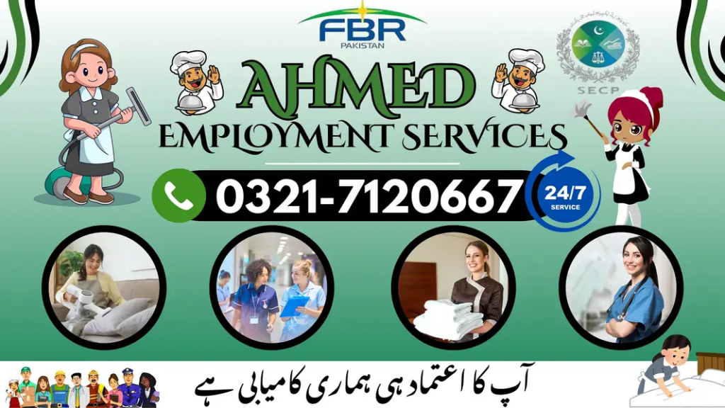 "Ahmed Employment Company"All kind Of Professional Relaibal Trained or Verified Domestic Staff or Office Staff or Patients Care Services at Home Staff 12/7 or 24/7 Male or Female Avalibale in All over Pakistan. Call Now for Hiring Reliable & Trustworthy Staff. Philippine Babysitters(Trained) To Proper TakeCare for Babies. Male/Female Elder/Patient Care(Trained) To Proper Take Care for(Qualified) IV/IM Injections,NG Tube, Suction, Physiotherapy, IVCannula etc. Nurses(Proper Medications)Formal House Maid (Dusting+Cleaning,Laundry+Ironing, Proper Kitchen Help)House KeeperMale (Dusting+Cleaning,Laundry+Ironing, Proper Kitchen Help)Professional NannyProfessional Cook(Pak-Chinese,Continental & Italian Foods)Domestic Cook(Desi Pakistani Cooks)Professional Driver(Staff Driver)Domestic Driver(Domestic Driver CumNoor EmployementAll kind Of Professional Relaibal Trained or Verified Domestic Staff or Office Staff or Patients Care Services at Home Staff 12/7 or 24/7 Male or Female Avalibale in All over Pakistan. Call Now for Hiring Reliable & Trustworthy Staff. Philippine Babysitters(Trained) To Proper TakeCare for Babies. Male/Female Elder/Patient Care(Trained) To Proper Take Care for(Qualified) IV/IM Injections,NG Tube, Suction, Physiotherapy, IVCannula etc. Nurses(Proper Medications)Formal House Maid (Dusting+Cleaning,Laundry+Ironing, Proper Kitchen Help)House KeeperMale (Dusting+Cleaning,Laundry+Ironing, Proper Kitchen Help)Professional NannyProfessional Cook(Pak-Chinese,Continental & Italian Foods)Domestic Cook(Desi Pakistani Cooks)Professional Driver(Staff Driver)Domestic Driver(Domestic Driver CumHelper)Couples(Wife Domestic Works+Cooking, HusbandHelper)