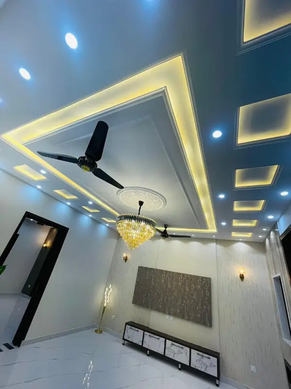 Drawing Room with tasteful wall panels and lighting