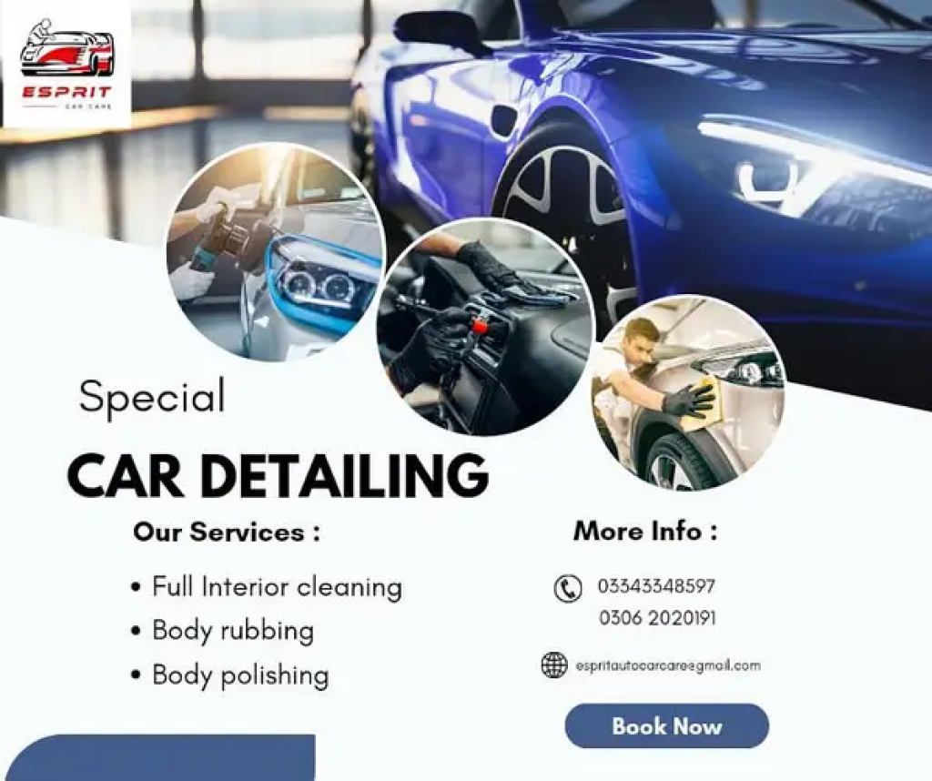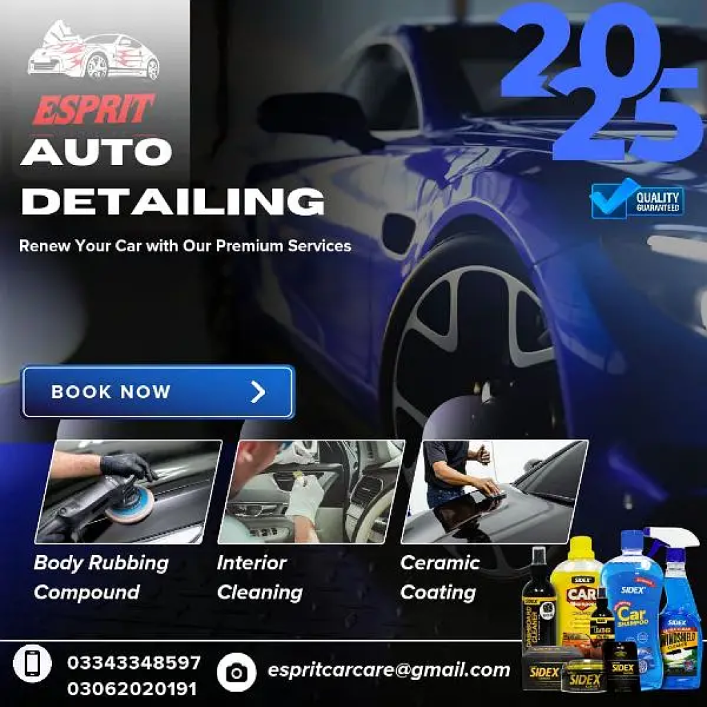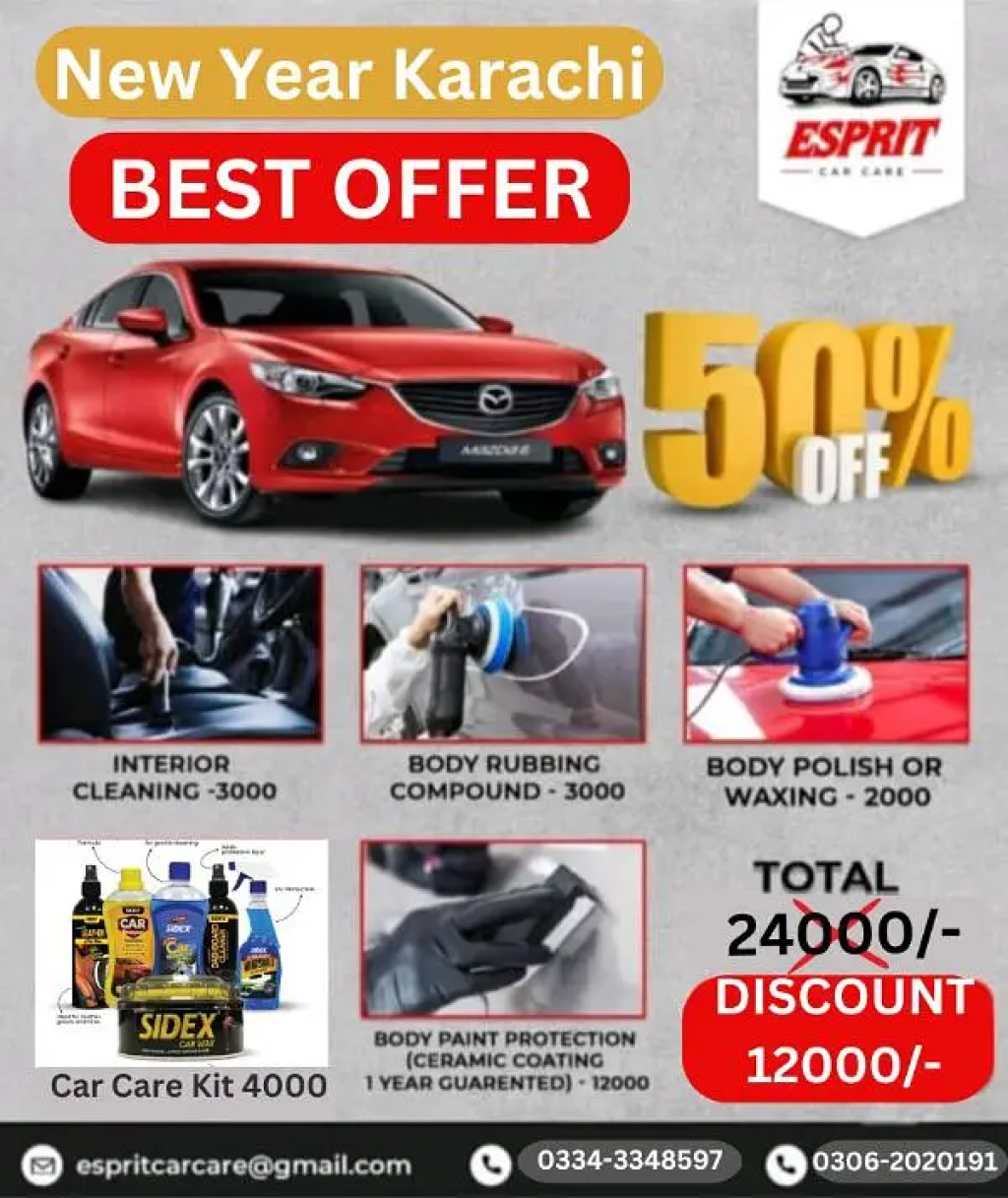 "Esprit Car Care"New Year Discount Offer 2025Only For Karachi DOORSTEP SERVICE AVAILABLE We Are providing Best Service In karachiInterior cleanWax And TouchupBody CompundCar Ceramic Coating Car Detailing Glass Coating PPF Application Care Care Products GIFT as complementary Call for more details 0306/2/0/2/0/1/9/10334/3/3/4/8/5/9/7