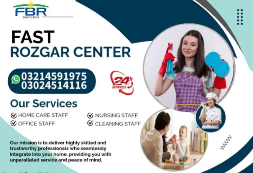 FAST ROZGAR CENTERTHE NAME OF TRUSTOur mission is to empower individuals through gainful employment and support businesses by providing them with skilled and motivated workers, fostering economic growth and community developmentAt FAST ROZGAR CENTER, we offer a wide range of services including:-House Maids -Professional Drivers -Chineese Cook Chef -Trained Nurse-Professional Nanny-Kitchen Helper-Sweeper-Patient Care Taker -Professional BabySitter-Gardner -Security Guard -Couple For Domestic WorkWe Provide You an Easier Life With Our Domestic ServicesNeat And Clean Experienced Staff With 100% GuaranteeFor Any Information Call Us 0321/4591/975