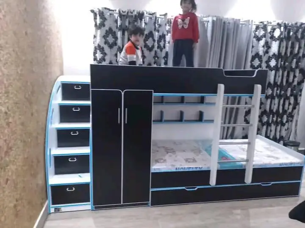 ----AB KIDS FURNITURE--------We Deal all Kinds of Wooden kids Furniture like Bed Set (Bed, Double and Single Bed)Side Tables, Bed Dressing, kids almair and Other Home Items. *Solid & beautiful Bedroom set Available in Reasonable price. ----|Made with lamination imported sheetA+ Material used5 to 7 years warranty1 Portion can bear weight of 150kgsMany colors and designs AvailableCHANGES ARE APPLICABLE ON CUSTOMER DEMAND|*Graceful and decent design. Best Quality and Finishing*Solid wood structure and 1st quality material used*No compromise in quality of product & polish. 1 Side is sliding that can be attached with the bed. 2 drawers are provided with proper railings to place baby clothes, pampers or anything . Wheels are provided to make it easy to move if required. Single Bed With Stduy Unit. "| Bunk Bed || Single Beds||Themed Beds ||Car Beds ||Bunker Beds | |Study Table ||Trundle Beds|shoe rack |"Customize Able SizeBook Online or Visit Us: "AB KIDS FURNITURE" |Kids Furniture Manufacturers A+ Quality Location :1 SHOP IALAMBAD " H/13 near golra mor"2 SHOP LAHORE "canal bank opposite of tajbagh"For More Designs And Delievery Charges Information Contact On My Whatsapp: 031/82/44/50/49 "all over pakistan delievery"