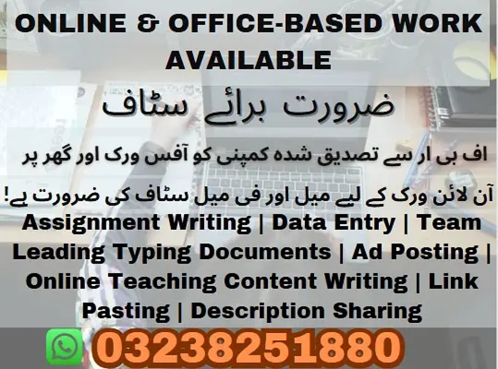 کمپیوٹر،لیپ ٹاپ یا موبائل پر کام کرنے کے لیۓ میل اور فیمیل سٹاف کی ضرورت ہے. یہ کام آپ موبائل لیپ ٹاپ یا کمپیوٹر سے کر سکتے ہیںوقت کی کوئی پابندی نہیں جب ٹائم ملا کر لیا لیکن یاد رکھے روز تیس منٹ کام کرنا ضروری ہےابھی واٹس ایپ# نمبر(O323/8251/88O)پر میسج کریں اور گھر بیٹھے پیسے کمائیں اور بیروزگاری سے نجات پائیں. گورنمنٹ آف پاکستان سے رجسٹرڈ ادارہ. . . Male and Female Staff needed for Office working and Online working in our FBR Registered CompanyQualification required: Matric to MastersNo Age Limit & No Experience requiredاگر آپ کے پاس کوئی تجربہ نہیں ہے تُو ہم آپ کو کام کی آن لائن ٹریننگ دیں گےWe have three Shifts of Job•Full-Time: 10am To 6pmIncome: (35,000 To 45,000)•Part-Time: 10am To 2pm ، 2pm to 6pmIncome: (25,000 To 35,000)•Home-Base: 2 to 4 Hours dailyIncome: (20,000 To 25,000)Send your short details on WhatsApp1-Name2-Qualification3-Experience4-Age5-Area and City?Our WhatsApp Number:O323/8251/88O![]()